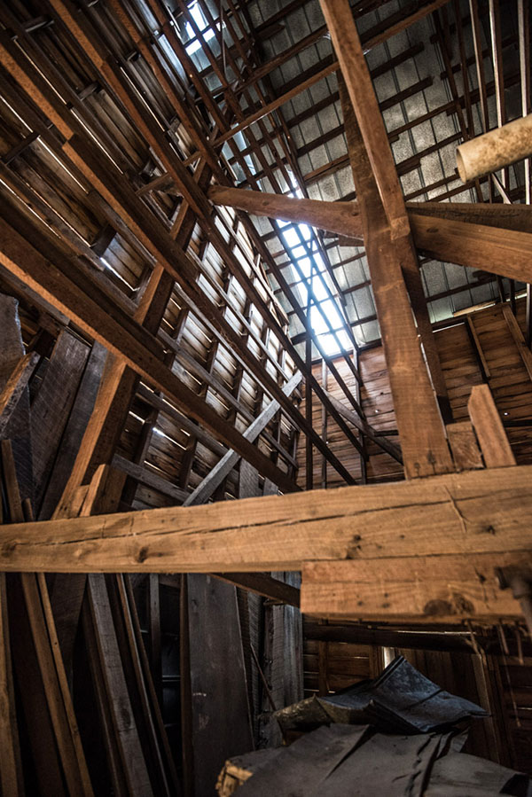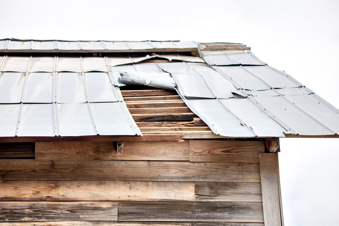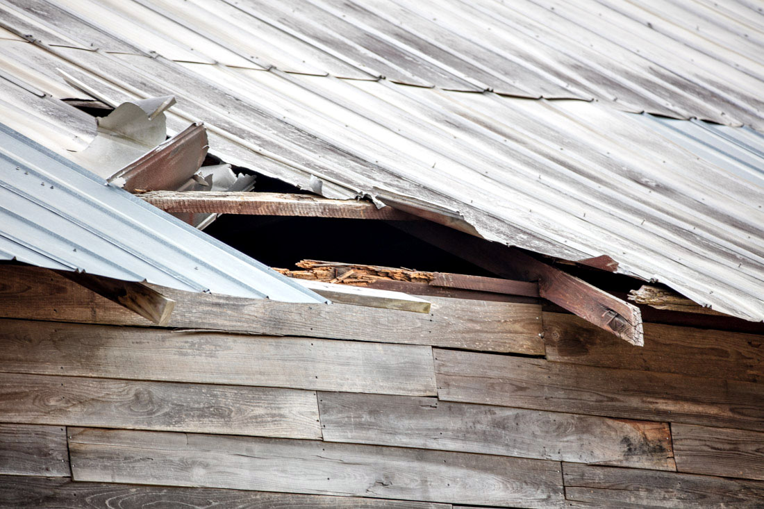 The barn is in need of roof repair. Wood replacement is
